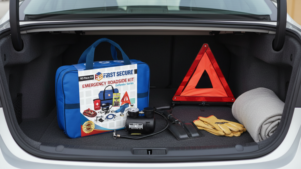 - Most complete “everything included” kit: Car Emergency Kit with Air Compressor + Jumper Cables